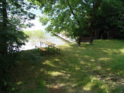 Unser Haus liegt umgeben von Wiesen und Bäumen, etwa drei Gehminuten vom eigenen Badestrand entfernt.